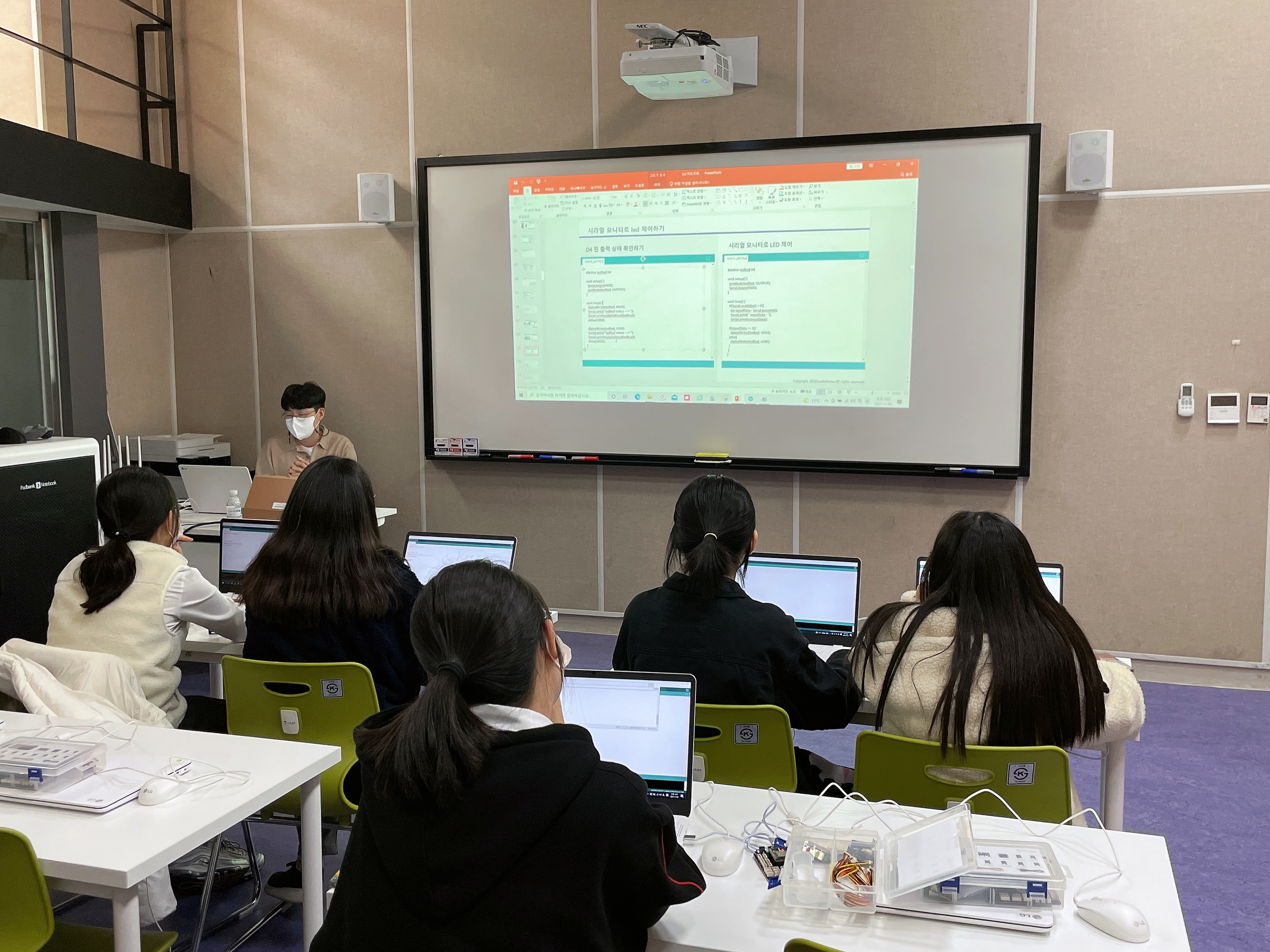 간단하게 센서를 제어하는 법을 먼저 배웠는데요, 곧잘 따라하네요ㅎㅎㅎ 하나를 알려주고 업그레이드 된 과제를 내주면 또 그걸 해내는 친구들입니다.
