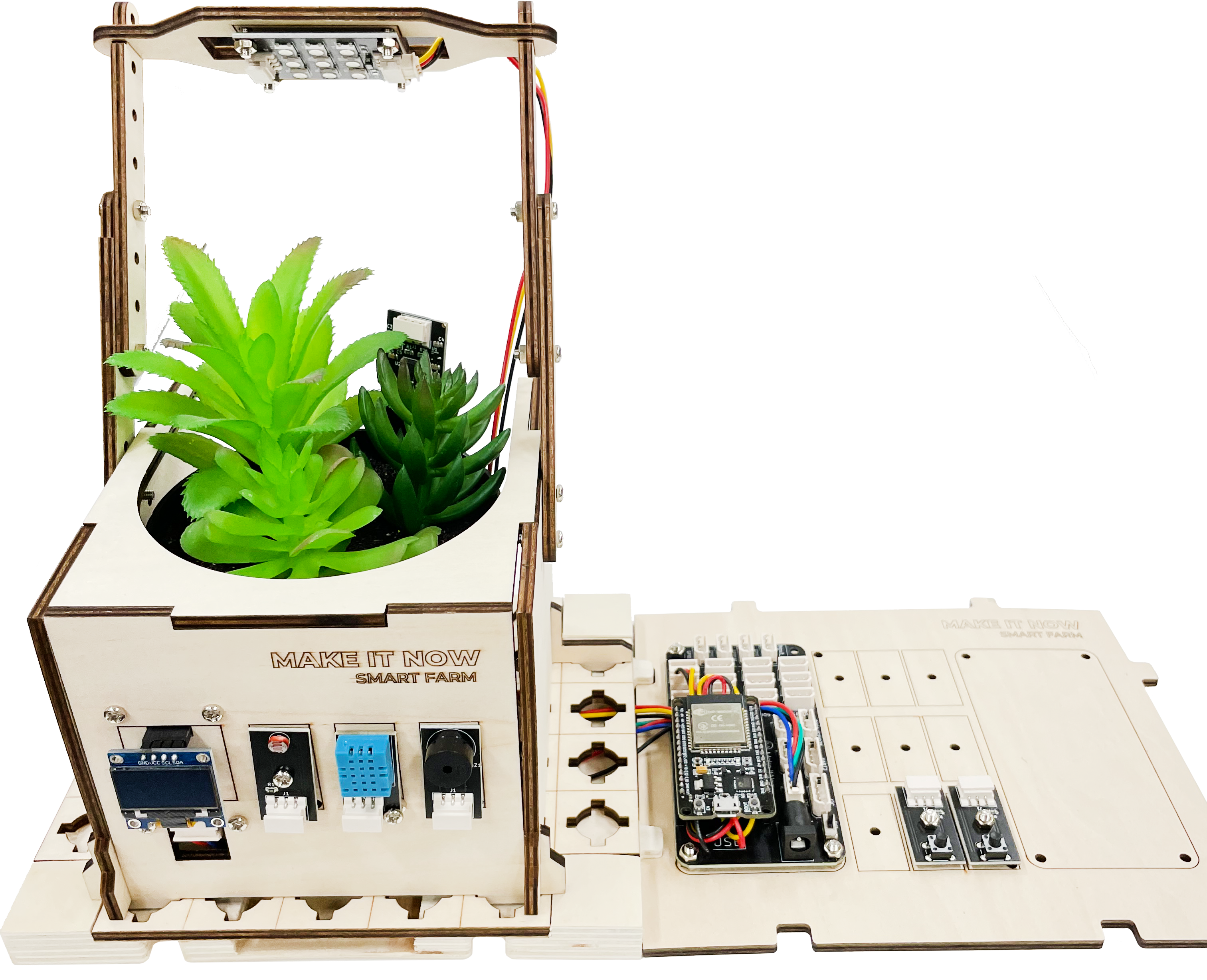 메이크잇나우 스마트팜 키트에서는 식물이 빛을 가장 잘 받도록 상단에 위치하고 있으며, 식물의 성장을 방해하지 않도록