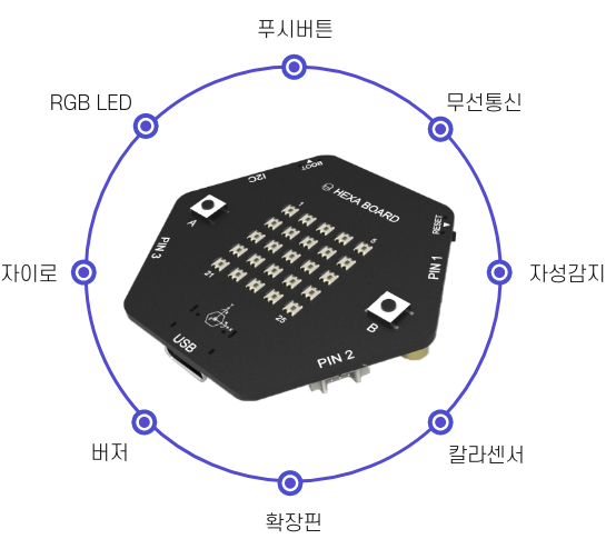 헥사보드는 5cm 정도의 크기에 5x5 네오픽셀, 자이로센서, 버저, 칼라센서, 버튼을 내장하고 있어 보드 만을 가지고도 수 많은 피지컬 컴퓨팅 수업이 가능합니다 !! 특히 저희가 만든 Easy Blocks(이지블록스)와 연계한다면 더 더운 쉽고 간편한 코딩이 가능합니다!