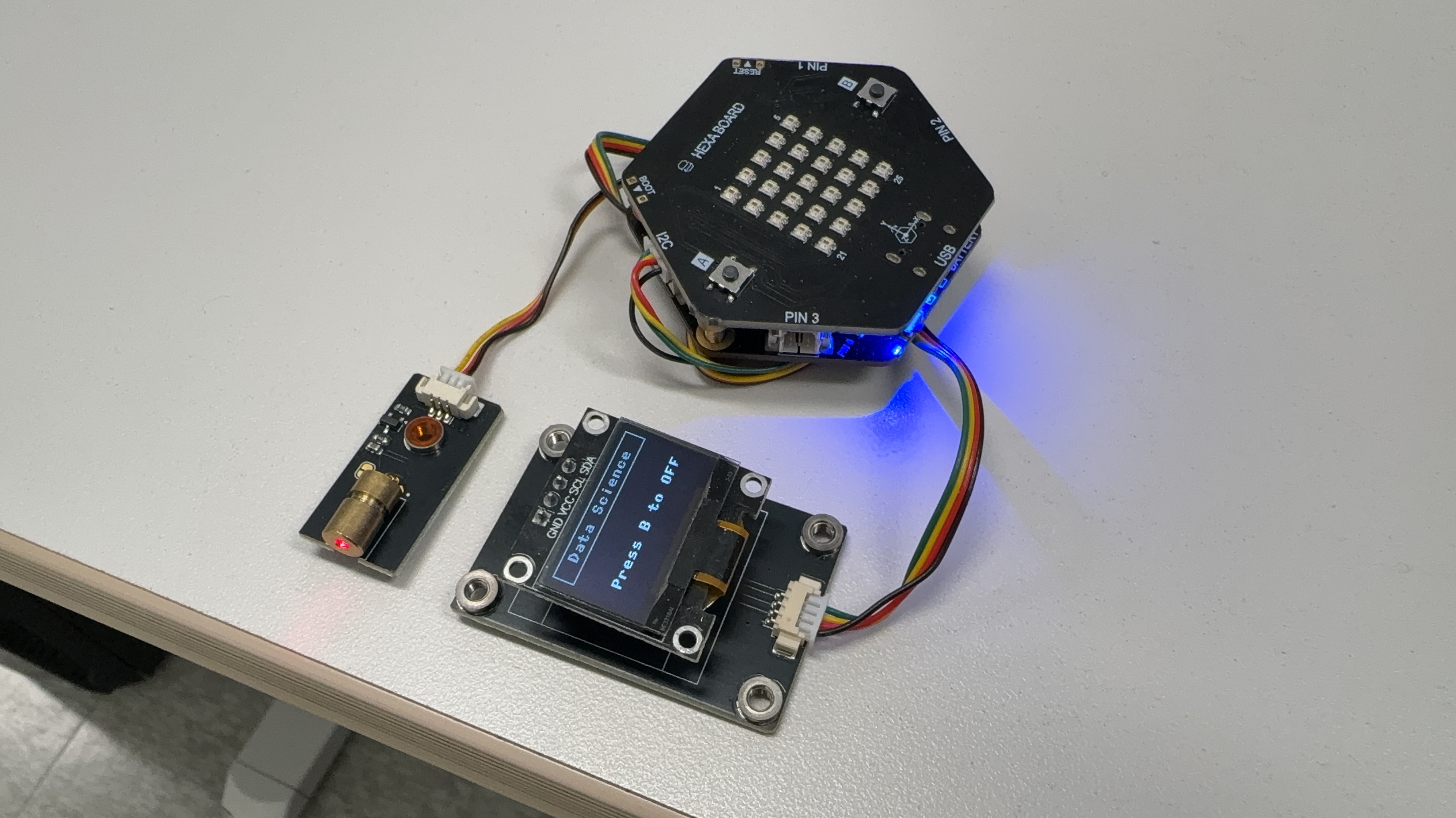 레이저를 발생시키는 레이저 모듈을 헥사보드의 버튼으로 on/off 하고,