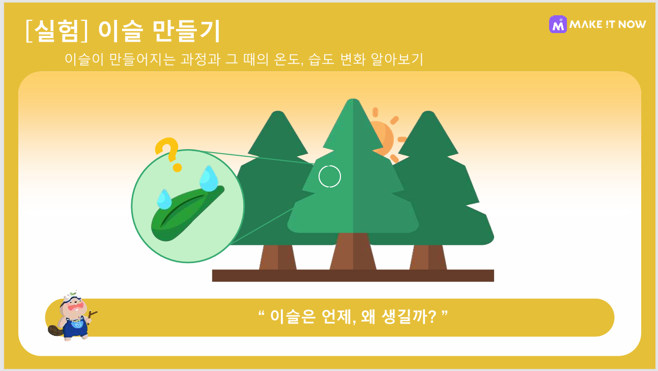 오늘은 초등학교 과학 / 5학년 2학기 / 3단원. 날씨와 우리 생활 / 이슬이 만들어 질 때 온도와 습도 변화 실험을 하려고 합니다.