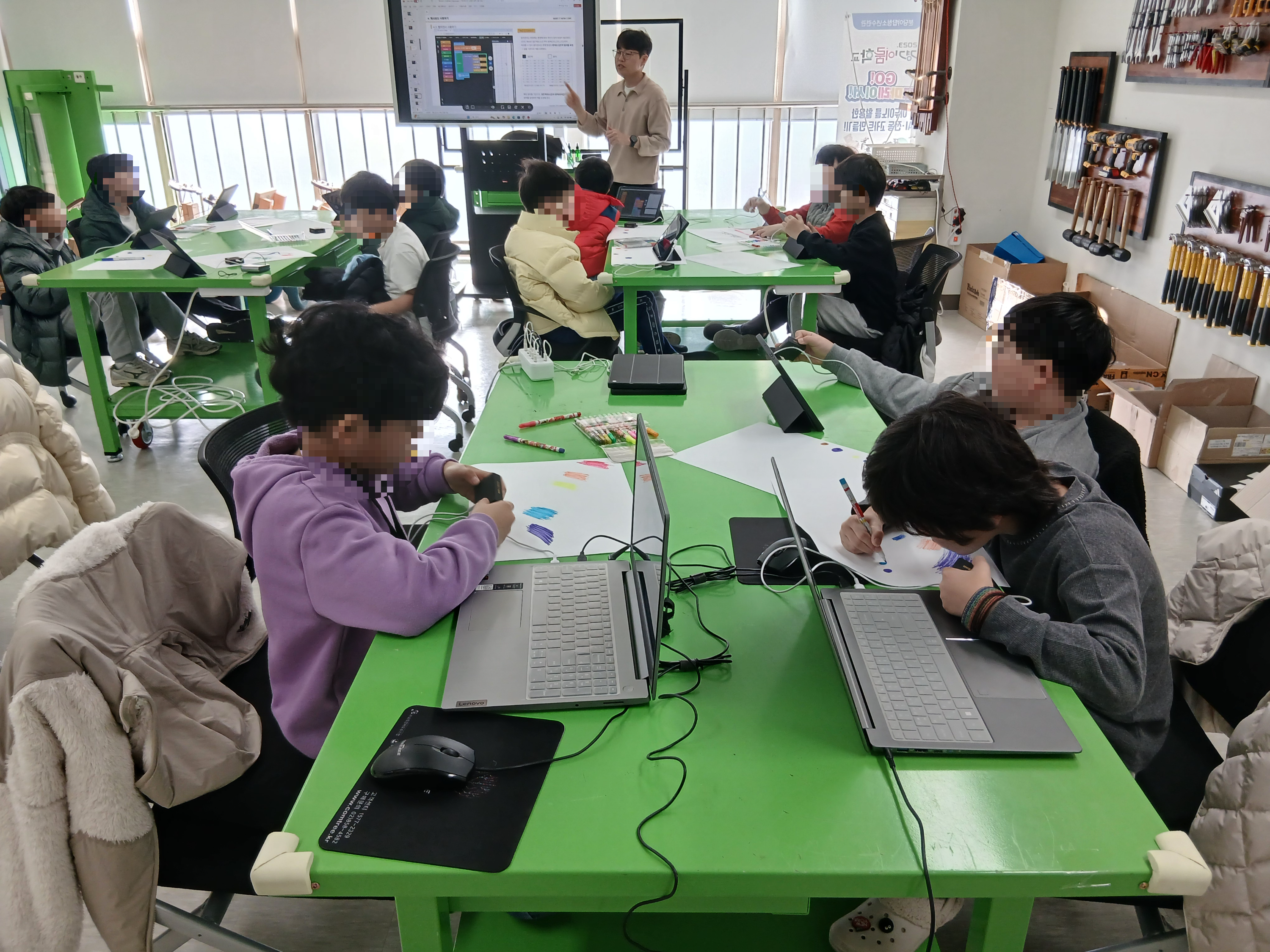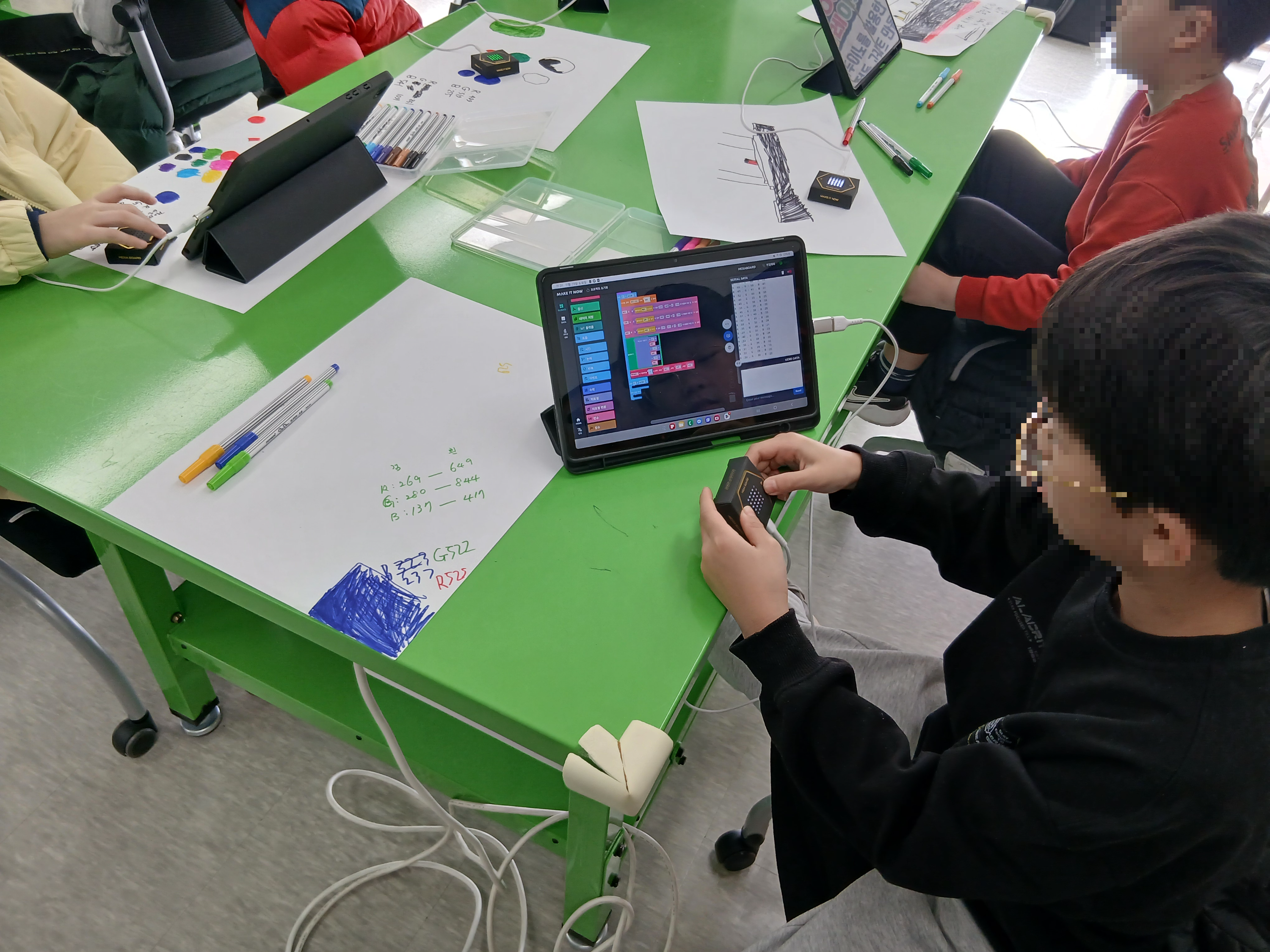 다양한 색상을 칠하고 학생들이 헥사보드를 활용해서 색상값을 읽고 있어요.